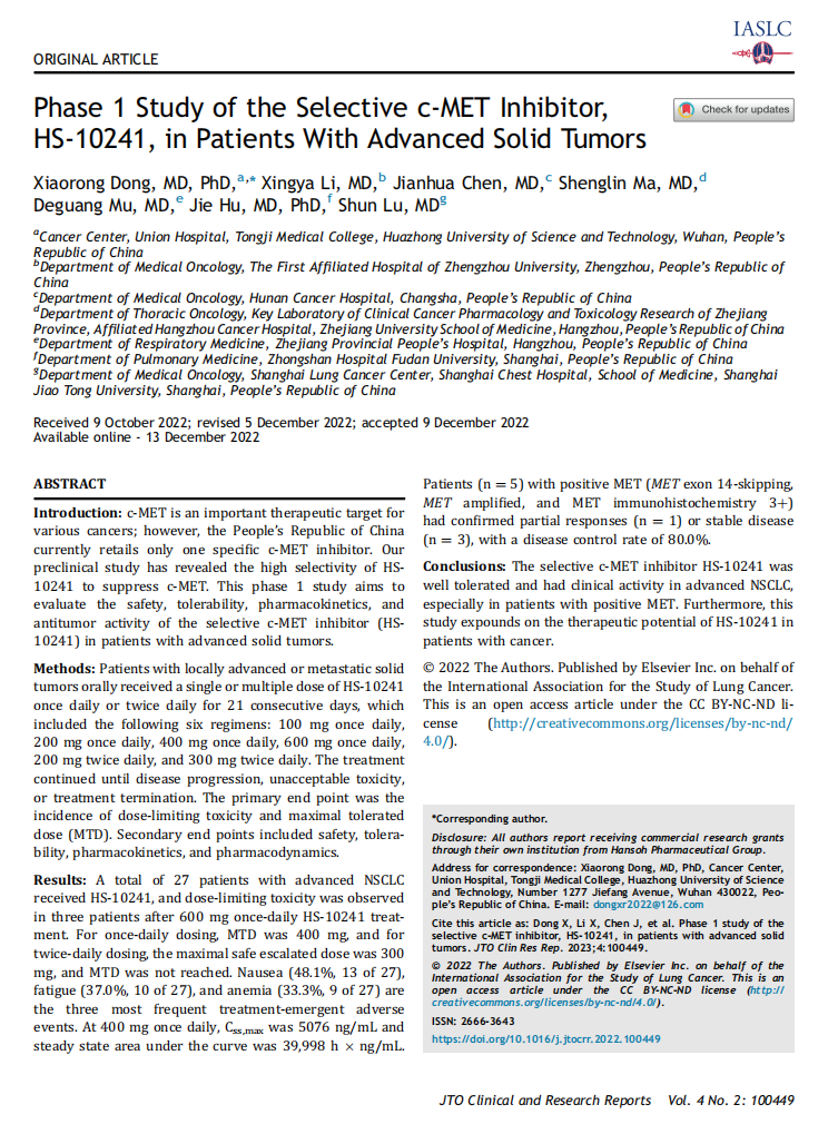 本次发表的I期剂量递增研究结果显示,HS-10241的安全耐受性良好。经一天一次(QD)和一天两次(BID)给药后,QD给药的最大耐受剂量(MTD)为400 mg,BID给药的最大适用剂量为300 mg。最常见的不良事件主要表现为消化系统反应(恶心、呕吐)和肝酶异常(ALT升高和AST升高等)。有效性方面,在HS-10241单药治疗下,即在c-MET阳性的患者中观察到肿瘤治疗反应,表明本品具有确切的抗肿瘤活性。